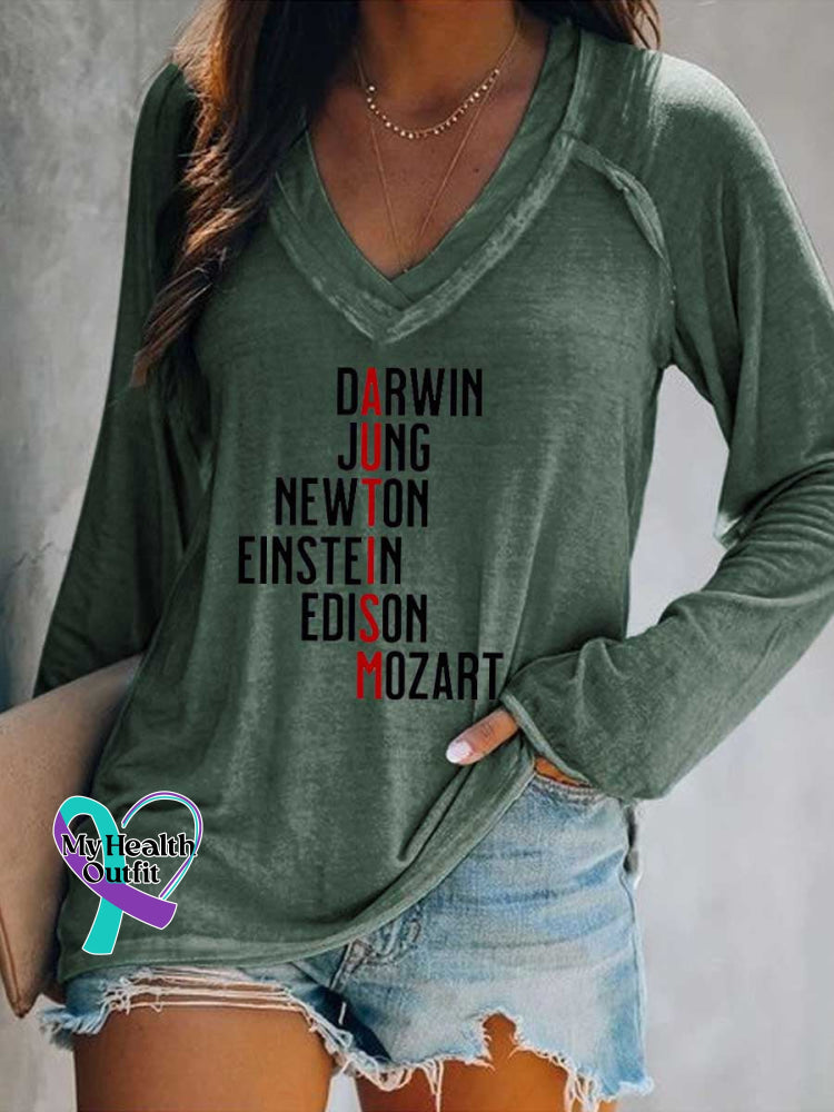 Women's Darwin Jung Newton Einstein Edison Mozart Autism Awareness Print V Neck Long Sleeve Tops
