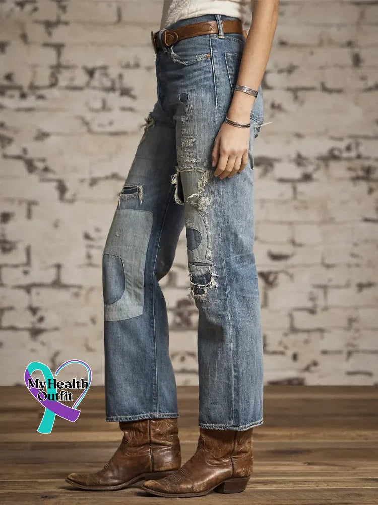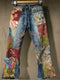 Women's Vintage Pattern Art Print Casual Cotton Denim Jeans