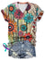 Women's Retro Floral Colorful Boho Pattern V-neck Casual T-Shirt
